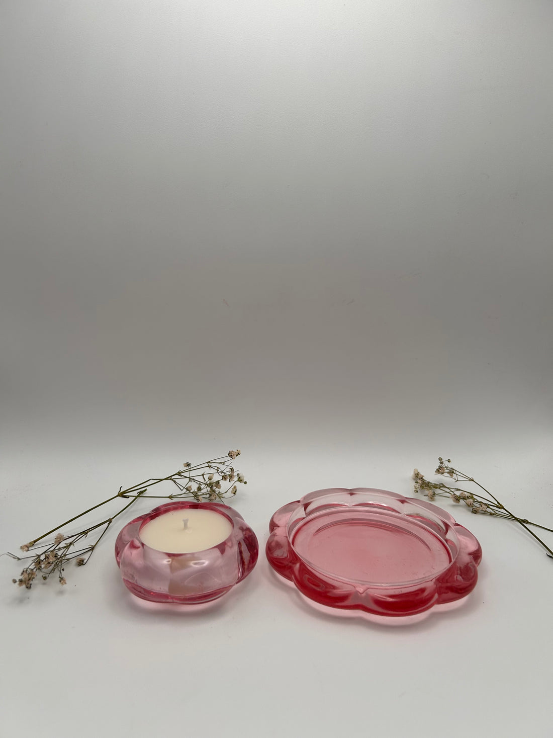 flor rosa, mini vela fruta de la pasión y posavelas rosa cristal.